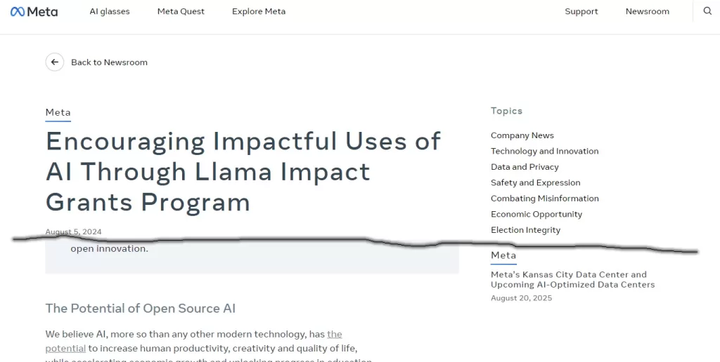 Se poate vedea încrederea asociată conceptului open-source într-un articol (încă) disponibil pe pagina Meta [12]; furnizat aici cu titlu de exemplu, ele fiind mult mai multe