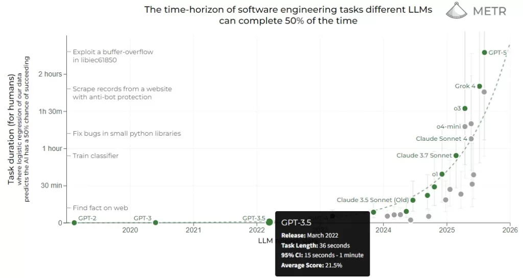 În graficul de mai sus se poate vedea că orizontul de timp pe care și-l pot stabili aceste AI-uri este în creștere. Când a apărut GPT-3.5 în 2022, acesta putea executa sarcini de programare al căror orizont putea fi de maxim 36 de secunde. Astăzi agenții AI pot realiza autonom sarcini de programare care le iau oamenilor mai bine de două ore. Este deja evident de ceva timp că durata sarcinii pe care o pot realiza agenții software se dublează la fiecare șapte luni [7]. Dacă totuși ne uităm cu mai multă atenție la grafic, vedem că linia verde punctată nu pare să se mai potrivească cu noile puncte. Oare de ce?