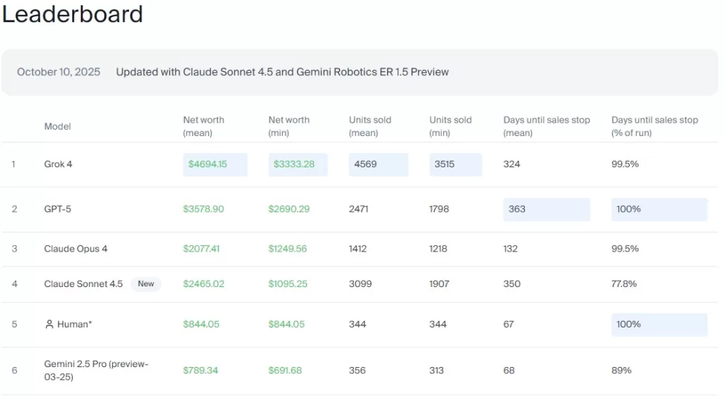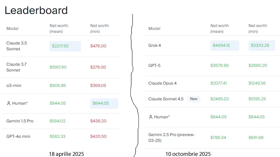 La momentul startului, atât cel al proiectului demarat de Andon Labs [16, 17], cât și al benchmark-ului pentru automatele de vânzare, Claude 3.7 conducea clasamentul fiind foarte, foarte bun (prin comparație, jucătorii umani ocupau locul cinci). Grok însă, după debutul pe platformă, a început să facă ravagii. A pornit cu 500$ – capital identic cu al tuturor celorlalte modelele și, conform așteptărilor, trebuia să-i folosească pentru a cumpăra produse ce se vindeau la automat căutând să descopere singur care sunt cele mai populare și ce trebuie să facă pentru a produce profit. În timp ce GPT-4o mini și Gemini 1.5 Pro au ajuns să piardă, Grok 4 a obținut aproape 5000$. Așadar a avut o rată de profitabilitate de aproape 1000%… ceea ce nu este deloc de neglijat.